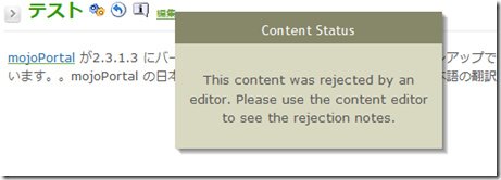 「原稿として編集できるロール」のユーザーは「情報」アイコンをクリックすると編集者が拒否をしたことがわかります。また、編集画面で拒否理由を見ることができます。