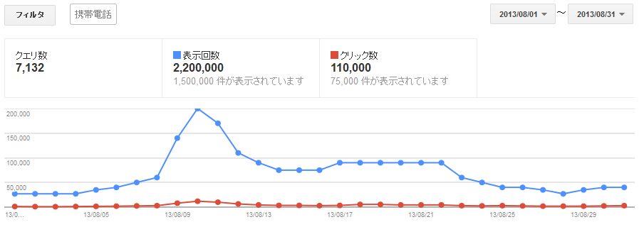 下の図が自分の運営しているサイトの一つの8月分の Google 「ウェブマスター ツール」のグラフである。上の図が通常のPCからの検索の表示回数と自分のサイトへのクリック数、下の図がモバイルからの検索の表示回数と自分のサイトへのクリック数である。検索の表示回数でいうと、PCからは100万回に対して、モバイルからは実に220万回と2.2倍の検索があったということになる。そのうえモバイルは何時何所ででも利用できるので時間的にもアクセスが集中しやすいという特徴がある。