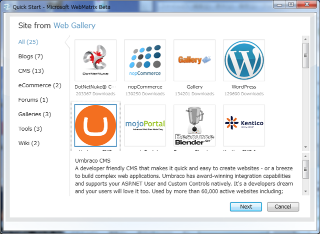 Web Paltform Installer 3.0 Beta では、Webアプリの作成と運用に必要なツールをパッケージ化した「WebMatrix」のBeta 版をインストールすることができます。WebMatrix は、IIS Developer Express、ASP.NET、SQL Server Compact から構成されているそうです。