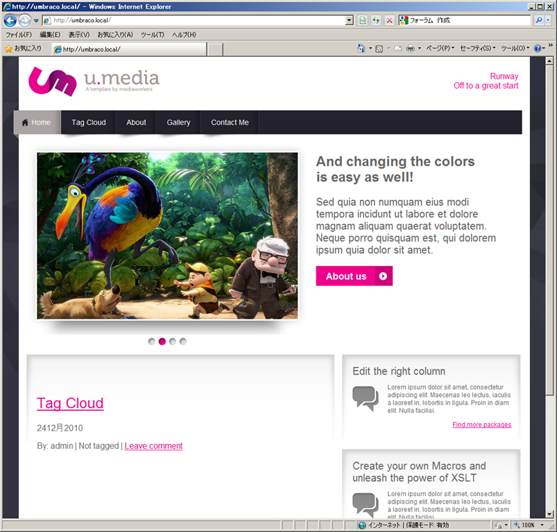 Umbraco 4.6 (コードネーム Juno) のベータ版が12月24日に公開され、CodePlex のページからダウンロードできるようになっています。Umbraco 4.6 ベータを実際にインストールしてみると、ユーザーエクスペリエンスが大きく改善されていることを実感しました。例えば、下の図のように、スターターキットが用意され、きれいで実用的なスキンがついてくるようなったり、管理画面ではダッシュボードにヘルプやドキュメントへのリンクが表示されるようになりました。Umbraco も開発者のための CMS というだけではなく、WordPress と同じように普通の人にも勧めることができる CMS に成長したんだということを感じています。特にデザイナーの方にはお勧めの CMS になったと思います。Umbraco 4.6 での新しい機能や改善点の主なものは以下のようなものです。