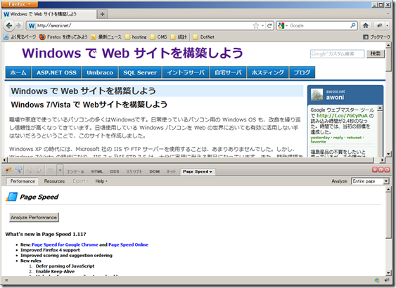 以前から、この Web サイトのレスポンスはあまり良くないと思っていましたが、Google ウェブマスター ツールの「サイトのパフォーマンス」で読み込み時間が4秒を超えるようになったので、これではいけないと思って Google Page Speed を使ってみました。Google Page Speed は、Web ページのパフォーマンスを評価して、ウェブページの読み込み時間を短縮するためのヒントを与えてくれるツールです。Page Speed には、FireFox 版と Chrome 版があります。今回は、FireFox 版を使いました。FireFox 版は、FireFox のアドインなので、インストールは簡単にできます。まず、Firebug 上で動作するので、Firebug アドインをインストールしていなければインストールしておきます。また、オンライン版の Page Speed である Page Speed Online もあるので、アドインをインストールしたくない場合は Page Speed Online を利用することもでき、Web ページの URL を入力するだけで、パフォーマンスの解析をしてくれます。