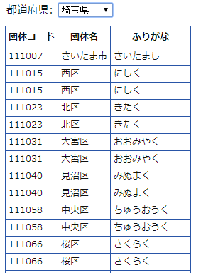 html += "<tr><th>団体コード</th><th>団体名</th><th>ふりがな</th></tr>";