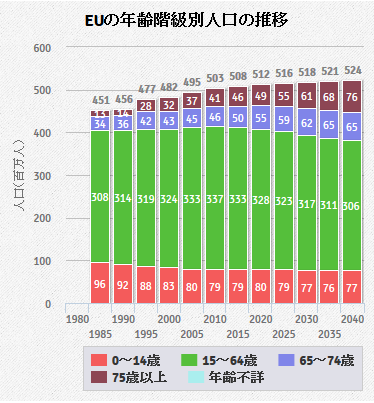 ヨーロッパは少子化が進んでいるというようなイメージがあったのですが、図をみればわかるようにヨーロッパ全体では人口は安定した動きになっています。少子化対策の優等生といわれるフランス(フランスの5歳年齢階級別人口の推移)やいち早く少子化が社会問題となったスウェーデン(スウェーデンの5歳年齢階級別人口の推移}では、リンクをクリックして見ていただければわかるのですが少子化対策が成功しているように思われます。