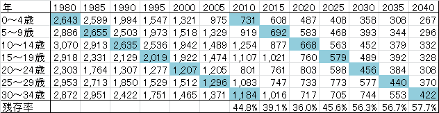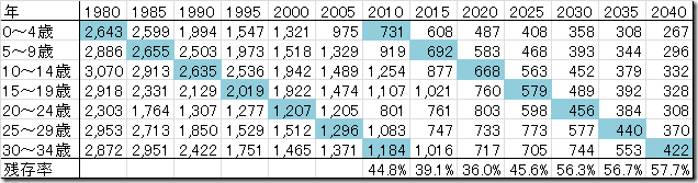 1980年に0~4歳だった人は2,643人ですが、30年後の2010年に30~34歳の人は1,184人です。正確ではないですが簡単にいえば、三好市で1976~1980年に生まれた人では、45%の人が地元に残り、それ以外の他の市町村に転出してしまっているということになります。1986~1990年に生まれた人だと地元に残る若者はわずかに36%です。1991~1995年に生まれた人は46%が地元に残ると推計されそれ以降も割合が増えていますが、それは純移動率の計算方法に原因があります。国立社会保障・人口問題研究所の地域別将来推計人口の「純移動率」の推計については以下のようになっています。