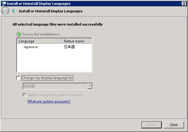 1-2-12. [表示言語の変更(change display language)] の画面が表示される(1-1-3. と同じ)ので、[Log off now] ボタンをクリックします。ログオフされるので、リモートデスクトップで再度接続すると日本語版になっています。コントロールパネルから再度「地域と言語のオプション」を起動して、 各タブを選択して、英語(米国)を日本語(日本)に修正しますが、今回は日本語で操作できるので簡単です。「管理」タブの「ユニコード対応ではないプログ ラムの言語」で「システム ロケールの変更」ボタンをクリックして日本語(日本)に変更すると変更の適用には再起動を求められます。再起動しても特に問題はないので再起動します。
