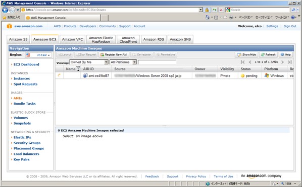 2-3. AMI の作成が開始されます。AMI の作成には small インスタンスで 10 分ぐらいかかります。AMI作成開始時には、Web ページもリモートデスクトップも動作しませんが、3、4分もすれば動作するようになるので、手軽にバックアップを取ることができます。[AMIs] の一覧を表示させると下の図のように作成中は [Status] が pending になっています。作成が完了すると available になります。[Snapshots] の一覧をみると新規に作成されたスナップショットが表示されます。