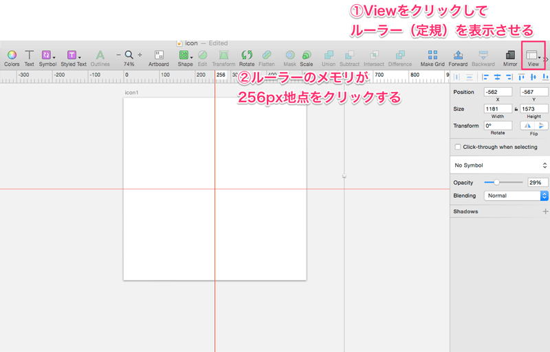 ViewメニューのShow Rulersをクリックしてルーラーを表示します。