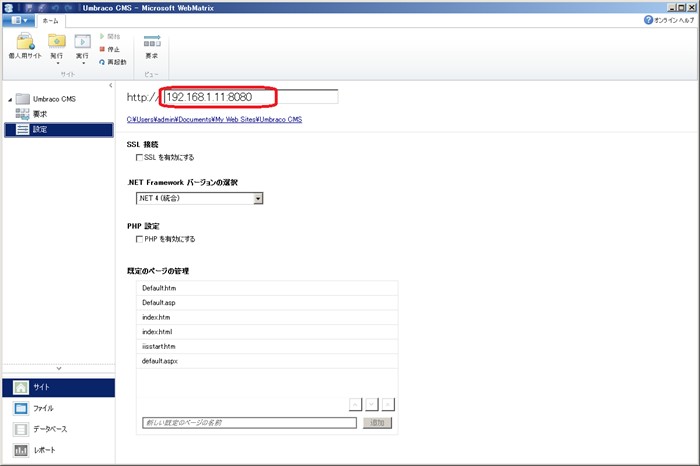 WebMatrix で、「サイト」の「設定」を選択すると以下の図のような画面になるので、http://以下に、ドメイン名又はIPアドレスとポート番号を入力してやりま す。例えば、IPアドレスが、192.168.1.11 で、ポート番号を8080に設定する場合は、192.168.1.11:8080 と入力します。それだけで、ドメイン名とポート番号の設定ができてしまいます。Web サイトを選択するとドメイン名とポート番号が変更されているはずです。